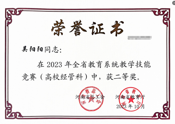在科研与教学的双重领域中,吴老师交出了一份亮眼的答卷:多次获得厅级课题资助项目,指导学生在科研、学科竞赛上斩获国赛一等奖的优异成绩,在省级教学技能竞赛中荣获一等奖。作为河南省重点科研项目获得者,吴老师将科研与教学深度融合。她坚持每年申报教改项目,认为其最大价值在于成果能快速反哺课堂。这种“科研服务教学”的理念,不仅让她获得专项资金支持,更形成了理论研究与实践应用的良性循环,在双重领域交出亮眼答卷。