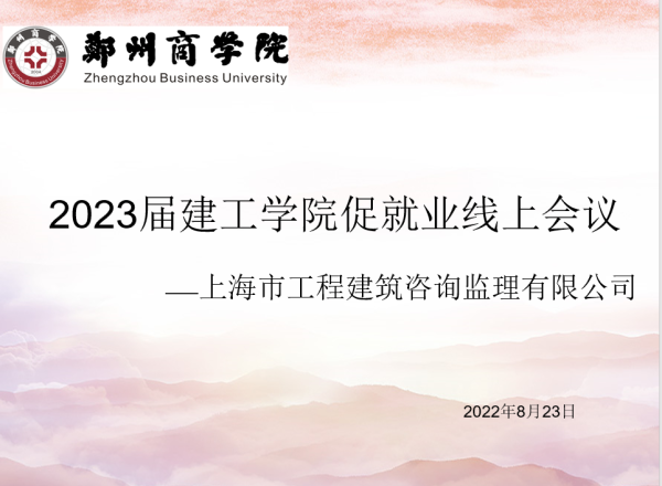 为深入贯彻党中央、国务院关于高校毕业生就业工作的决策部署,落实学校访企拓岗,深化校企合作,搭建校企合作平台,探讨人才培养新思路,探索产教融合新模式,全力促进高校毕业生高质量就业。8月23日,我院与上海市工程建筑咨询监理有限公司共同召开线上促进就业专题座谈会。我院院长孙利民、党委书记朱宏东、团委书记刘帅以及2023届毕业班辅导员参会。
