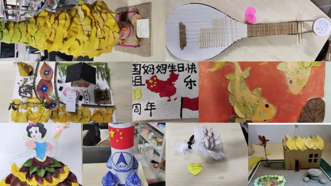 上午八点在亚泽大楼116进行作品收集,同学们的作品都很优秀,其中包括秋叶画,废弃物品所制作的房子、火箭、琵琶等模型,旧纸板所制作的海绵宝宝、我爱祖国等画册,充分体现了同学们真正参与其中,用自己的智慧和双手彰显了劳动精神。