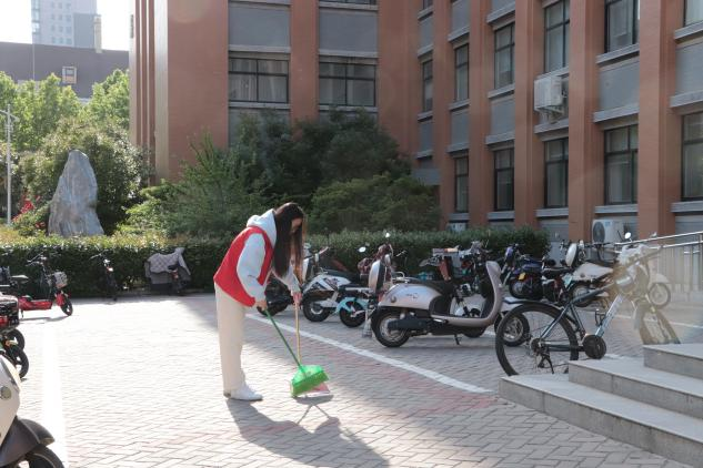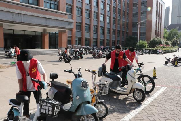 我院学生党员逐一将电车摆放整齐,并提醒过往的同学们停车入位,营造文明校园新风尚。党员志愿者们不怕脏、不怕累,清除大面积垃圾、捡拾枯枝杂草、打扫路面卫生,一点点清理,一遍遍检查,不遗漏一个死角。