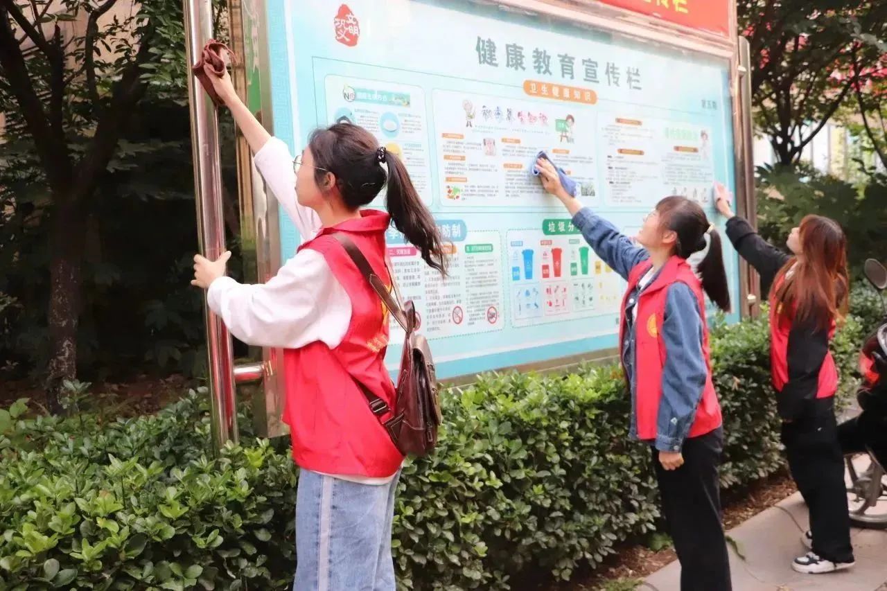 学习结束后,志愿者们主动参与到社区宣传栏的卫生维护当中,有的擦拭栏杆,有的捡拾街道上的垃圾大家相互配合,分工明确,井井有条。