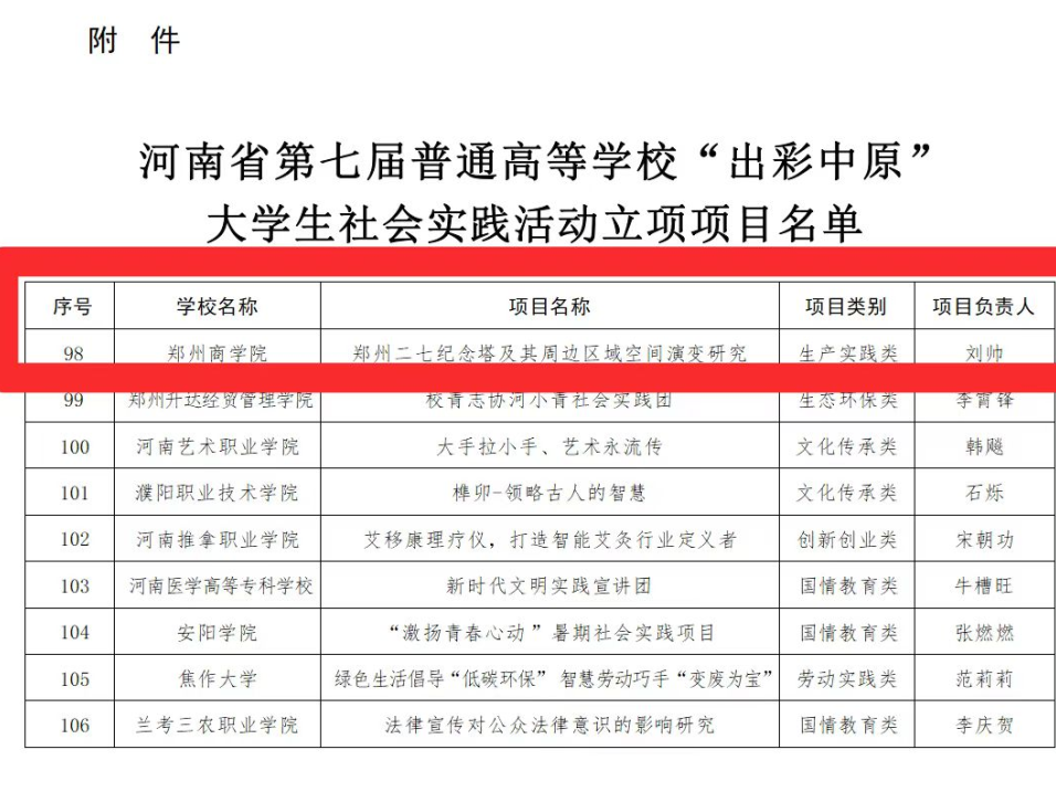 2024年3月7日,河南省教育厅关于第七届普通高等学校“出彩中原”大学生社会实践活动项目立项结果公示,taptap点点建筑工程学院的生产实践类实践活动“郑州二七纪念塔及周边区域空间演变研究”项目立项。