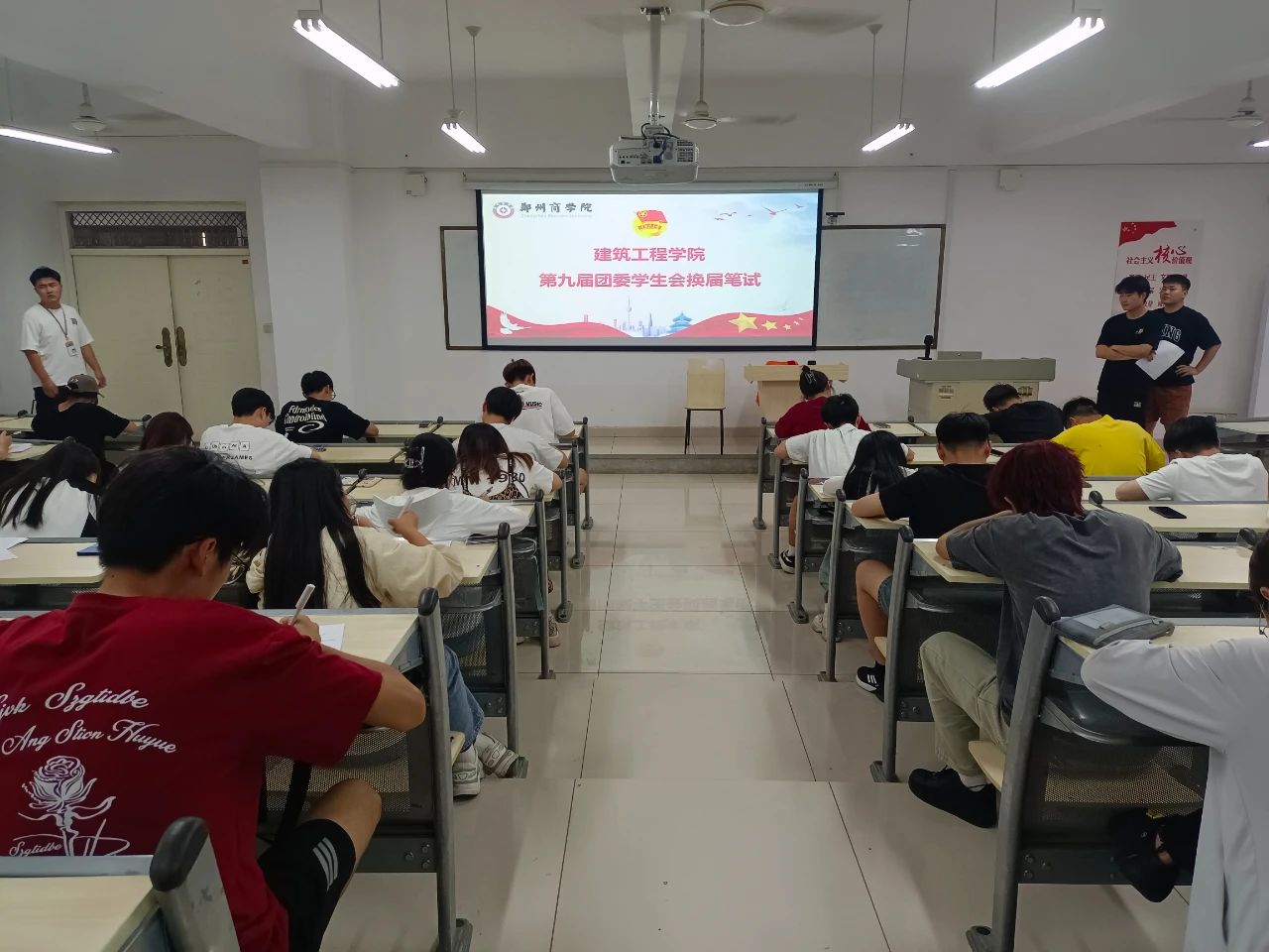 为进一步加强校学生会队伍建设,充分发挥校学生会的纽带作用,选拔出一批素质过硬、乐于奉献、全心全意为广大同学服务的学生干部,更好地为学院服务、为广大同学服务,建工学院于6月12日在亚泽楼211教室举行第九届团委学生会干部竞选笔试考试,由团委学生会主席团全体成员监考。