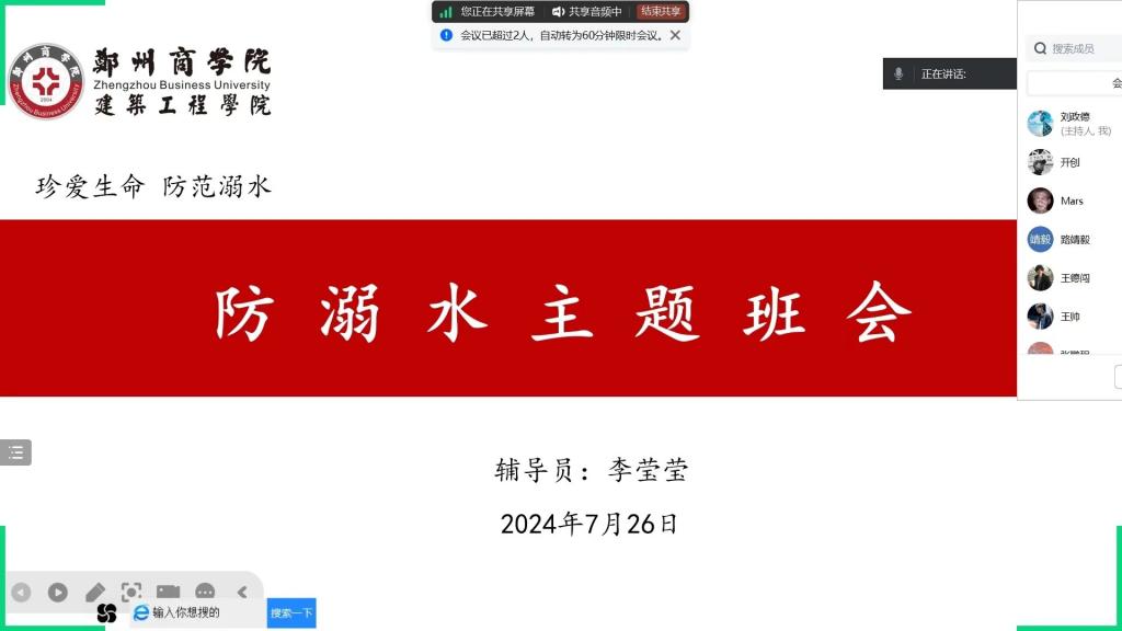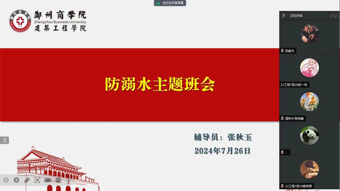 为切实做好暑期学生的安全教育及管理工作,提高学生安全防范意识和自我保护能力,建工学院落实《学工系统2024年暑期安全温馨提示》文件精神,于7月27日前召开了“珍爱生命 防范溺水”暑期防溺水主题班会。