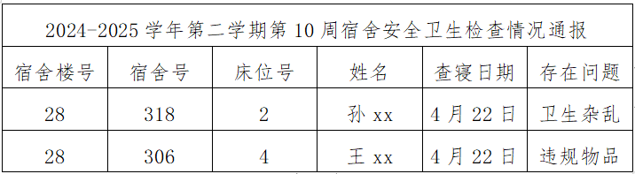 为督促同学们养成良好的安全和卫生习惯,激发广大学生的共建热情,改变我院学生宿舍安全和卫生状况,给同学们创造一个干净、舒适、整洁、卫生、文明的住宿环境。现将第10周宿舍检查情况通报如下: