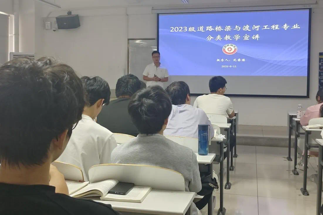 道路桥梁与渡河工程专业教研室主任范睿博从分层分类教学课程安排、考研和就业的选择、学院考研录取情况、考研备考与建议进行了宣讲,帮助2023级道桥学生深刻理解分层分类教学的目的和意义,并针对学生考研和就业方面的问题进行答疑,帮助学生做好学习和就业规划。
