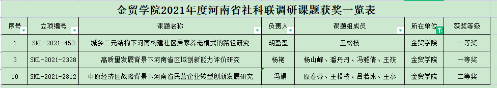 根据河南省社会科学界联合会《河南省社会科学界联合会关于2022年度调研课题立项的通知》(豫社科联字[2022]24号),我院3项2021年度河南省社科联调研课题获奖,其中一等奖2名,二等奖1名。望获奖同仁认真总结经验,再接再厉,以科研铸造辉煌。