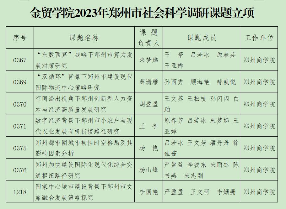 根据郑州市社会科学优秀成果评奖委员会的《关于郑州市2022年度社会科学调研课题立项的通知》(郑社评字〔2023〕4号),我院7项郑州市2023年度社会科学调研课题获批立项,立项编号为ZSLX2023+立项序号。立项名单见附件。