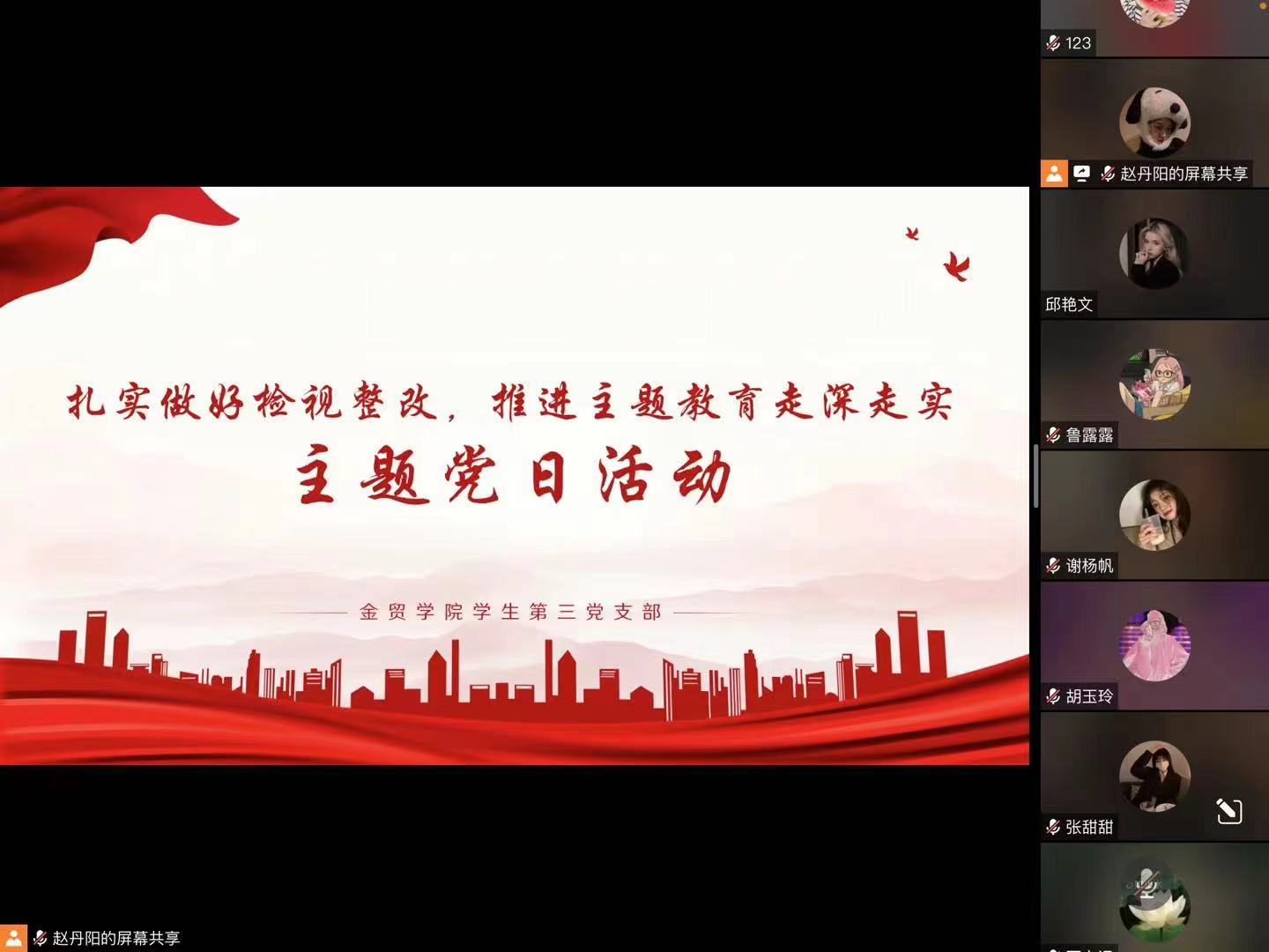 学生第三党支部书记赵丹阳老师带领学生第三党支部全体党员深入学习领会习近平总书记关于党的建设的重要思想,强调要做到全面强化问题整改。坚持边学习、边对照、边检视、边整改,把自己摆进去,深思教训启示,检视差距不足,全面自查自纠,强化问题整改。赵老师表示,作为年轻党员干部要坚持以党性立身做事,把说老实话、办老实事、做老实人作为党性修养和锻炼的重要内容,要善于独立思考,坚持求真务实。只有练就出过硬的政治能力,才能在思想上、政治上、行动上同党中央保持高度一致。