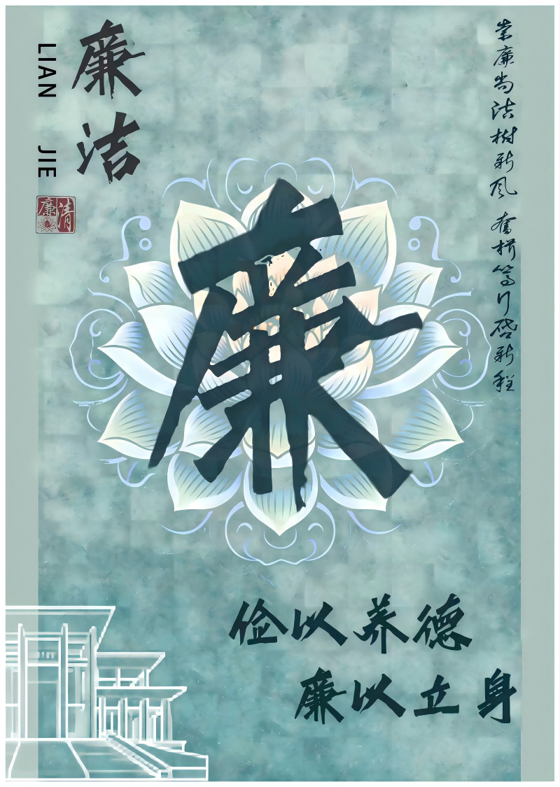 作品简介:这是一张以廉洁为主题的海报。海报的背景颜色为淡绿色,中央位置有一个大大的“廉”字,字体刚劲有力,凸显了主题。“廉”字的周围装饰有莲花图案,莲花象征着纯洁,与廉洁的主题相得益彰。