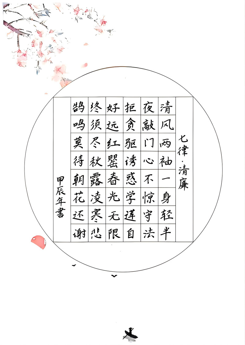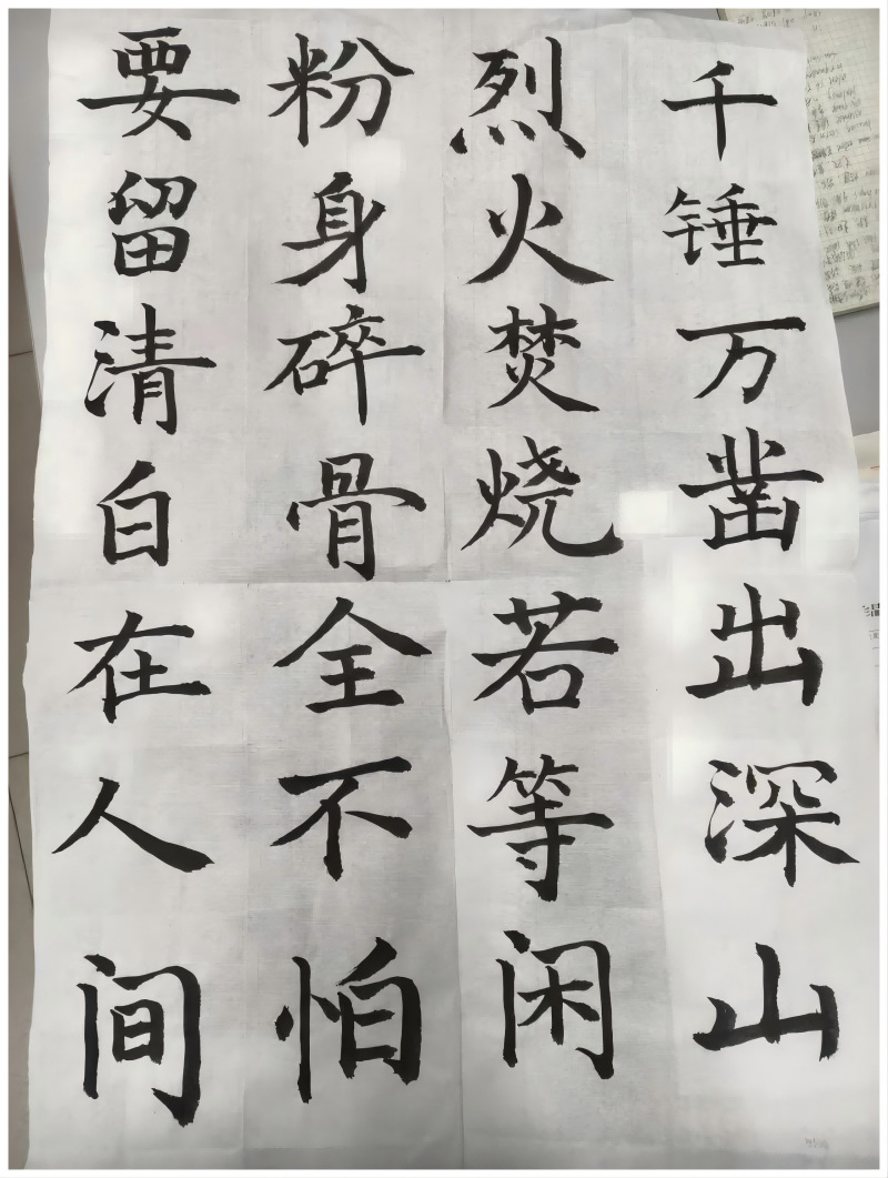 作品简介:这幅书法字体端正,笔画刚劲有力,体现出一种浩然正气,与诗中的廉洁精神相得益彰。通过书写这首诗,不仅展示了书法技艺,更传达了对廉洁品质的尊崇和追求。这种将文学与书法相结合的方式,在欣赏艺术的同时,也弘扬了廉洁文化。