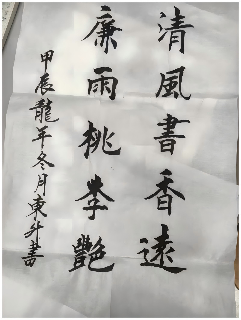 作品简介:书法作品字体工整,笔法有力,展现出一种古朴典雅的韵味。“廉雨桃李艳,清风书香速”这句话寓意着廉洁之风如同春雨一般,滋润桃李,使其茁壮成长;而清风则带来了书籍的香气,暗示着廉洁的环境有助于知识的传播和文化的繁荣。整体传达出对廉洁文化的赞美和推崇。润桃李,使教育环境更加清正。丰富了廉洁理念,塑造了师生正确的价值观,体现了廉洁文化在教育中的重要意义。