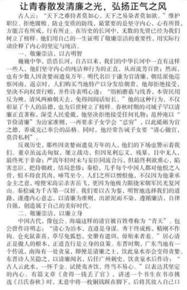 作品简介:文章开篇引用古人话语,点明坚守内心、拒绝腐败的重要意义。文中以“敬廉崇洁,以古明智”列举了诸多古代廉洁之士的事例。同时,文章也提到董卓、严嵩、秦桧等因贪婪而遗臭万年之人,以他们的下场警示后人。整篇文章通过这些事例,呼吁人们以古人的廉洁事迹为鉴,坚守内心意志,自律自强,走上廉洁之路,创造美好时代。
