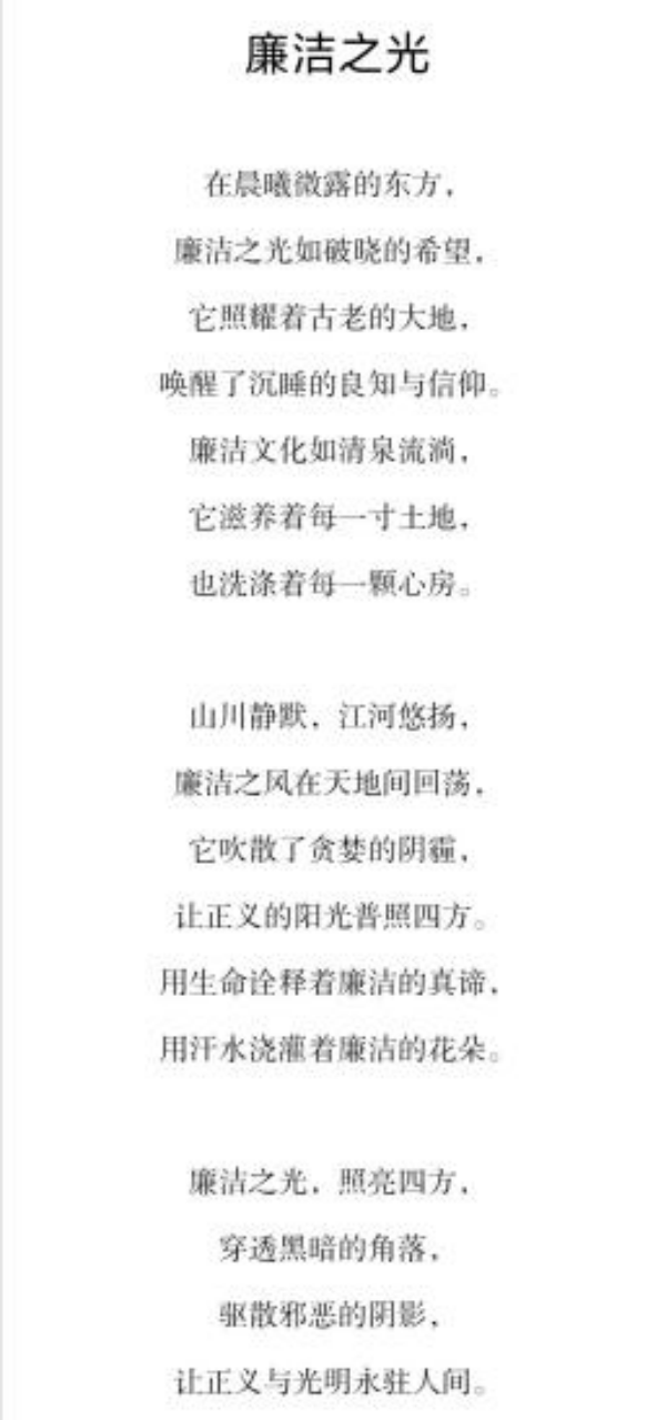 作品简介:本诗描绘了廉洁之光如同破晓的希望,在晨曦微露的东方升起,它照亮古老的大地,唤醒人们沉睡的良知与信仰。廉洁文化如同清泉流淌,滋养着每一寸土地,洗涤着每一颗心灵。山川江河都在宣扬着廉洁之风,这股风在天地间回荡,吹散了贪婪的阴霾,让正义的阳光普照四方。诗中强调要用生命诠释廉洁的真谛,用汗水浇灌廉洁的花朵。最后,廉洁之光被描述为能够照亮四方、穿透黑暗角落、驱散邪恶阴影的力量,让正义与光明永驻人间。整首诗通过对廉洁之光的赞美,表达了对廉洁文化和正义力量的歌颂与向往。