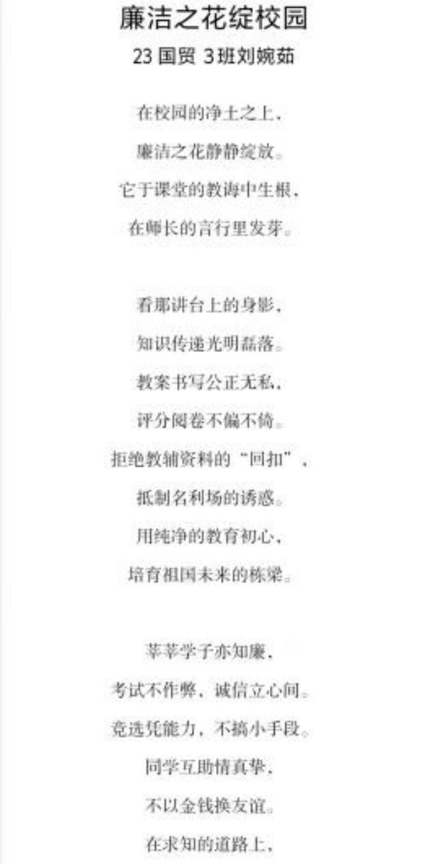 作品简介:本诗描述了廉洁之花在校园中生根发芽,它源于课堂的教诲和师长的言行。诗中刻画了讲台上老师传授知识时的光明磊落形象,他们公正无私地书写教案,不偏不倚地进行评分阅卷。并且,老师们拒绝教辅资料的“回扣”,抵制名利场的诱惑,以纯净的教育初心培育祖国未来的栋梁。