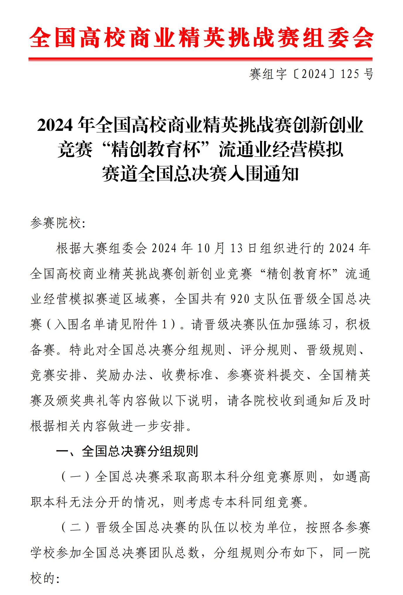 2024年10月13日,由中国国际贸易促进委员会商业行业委员会、中国国际商会商业行业商会和中国商业经济学会联合主办的2024年全国高校商业精英挑战赛创新创业竞赛“精创教育杯”流通业经营模拟赛道区域赛圆满举办,我院由物流管理专业组成的两支代表队成功入围全国总决赛。该比赛类属《2023全国普通高校大学生竞赛分析报告》竞赛目录,是我国高等商科教育领域中专业覆盖全面、校企合作深入、国际交流广泛的赛事活动,含金量极高。