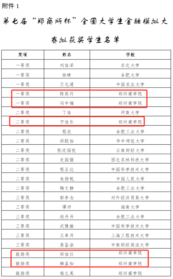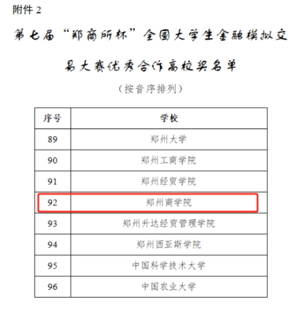 近日,由郑州商品交易所和中国期货业协会联合主办的2024年第七届“郑商所杯”全国大学生金融模拟交易大赛圆满成功,该比赛属于2024年河南省高等学校大学生学科竞赛省级竞赛项目,是我省高等商科教育领域中专业覆盖全面、校企合作深入的赛事活动,含金量极高。本次大赛吸引了全国2062所高校参加比赛,参赛的报名人数高达92041人。在我院投资学教研室主任朱梦娣及专职教师原春芬、赵冰洁、宋金璐老师的指导下,21级投资学专业陈奕行和冯中瑞同学荣获一等奖,宁佳乐同学获得二等奖,22级投资学专业郑佳仪和韩孟如同学获得鼓励奖。同时点点官网荣获优秀合作高校奖。
