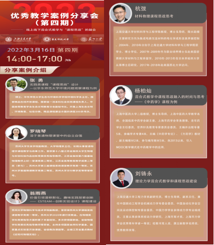 本次分享会分别由华东师范大学张勇、苏州大学罗晓琴副教授、苏州大学翁雨燕副教授、上海交通大学杭弢、上海中医药大学杨柏灿教授、上海交通大学刘铸永通过在线的方式从授课课程的问题出发,分析如何从课程内容重塑、课程资源建设、线上课程运行、线下教学方法创新、课堂评价设计等方面,分享线上线下混合式教学经验以及各自案例的课程思政经验。