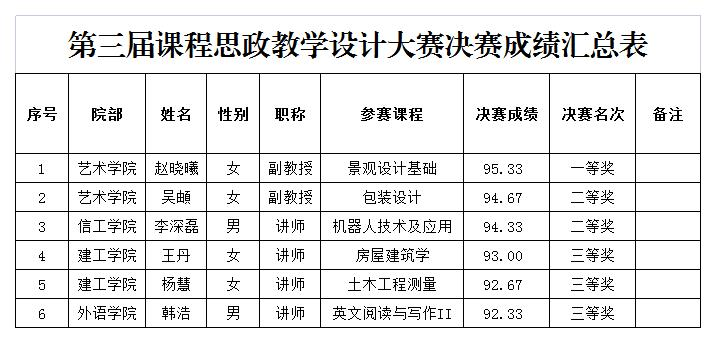 为贯彻落实教育部《高等学校课程思政建设指导纲要》文件精神,聚焦立德树人根本任务,营造浓厚的课程思政改革氛围,传播课程思政教学经验,提高课程思政育人能力,按照本学期课程思政建设总体安排,点点官网于2022年3月28日-2022年4月24日举办了第三届课程思政教学设计大赛。经院部初赛选拔,共推选17位教师参加学校决赛,经评委现场评议,评选出一等奖1名,二等奖2名,三等奖3名(见下图),优秀指导专家:马克思主义学院邢克鑫,优秀组织奖:艺术学院。现予以公示,公示期3个工作日(4月25日至4月27日)。