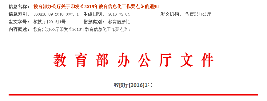【国家政策】《2016年教育 信息化工作要点》(教技厅[2016]1号)