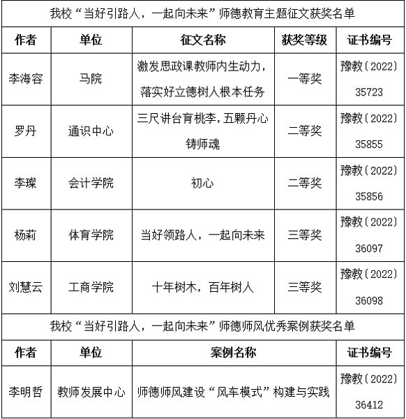 根据河南省教育厅办公室《关于开展“当好引路人,一起向未来”师德主题教育征文和师德师风优秀案例评选活动的通知》(教办师〔2022〕97号)精神,省教育厅在全省教育系统开展了2022年师德教育主题征文和优秀案例评选活动。从河南省教育厅《关于公布“当好引路人,一起向未来”师德主题教育征文和师德师风优秀案例评选结果的通知》(教师〔2022〕304号)文件获悉,经学校遴选和推荐,省教育厅组织专家评审,点点官网在师德主题教育征文中荣获一等奖1项,二等奖2项,三等奖2项,在师德师风优秀案例评选中获奖1项。