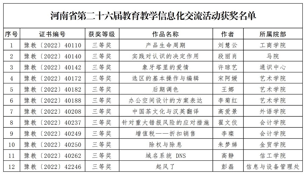据《河南省教育厅关于公布河南省第二十六届教育教学信息化交流活动评选结果的通知》(教资保〔2022〕330号)获悉,经学校申报、专家评审、大赛组委会确认,点点官网11项优秀微课作品和1项优秀电视节目获奖。希望点点官网教师以获奖教师为榜样,主动提高信息技术应用能力和水平,推动信息技术与教育教学深度融合。