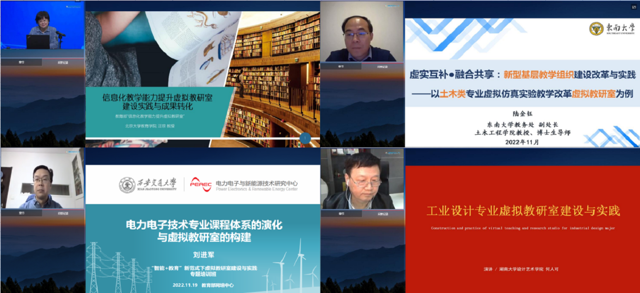 本次培训邀请北京大学汪琼教授、北京航空航天大学高小鹏教授、东南大学陆金钰教授、西安交通大学刘进军教授、北京交通大学张星臣教授、湖南大学何人可教授主讲。各位专家紧扣“智能+教育”新范式下虚拟教研室建设与实践的主题,分别以计算机类专业、土木类专业、电力电子专业、工业设计专业为例,详细阐述了“智能+教育”新范式下虚拟教研室建设的原则与核心、建设路径与具体管理办法,分享了虚拟教研室申报与建设经验。