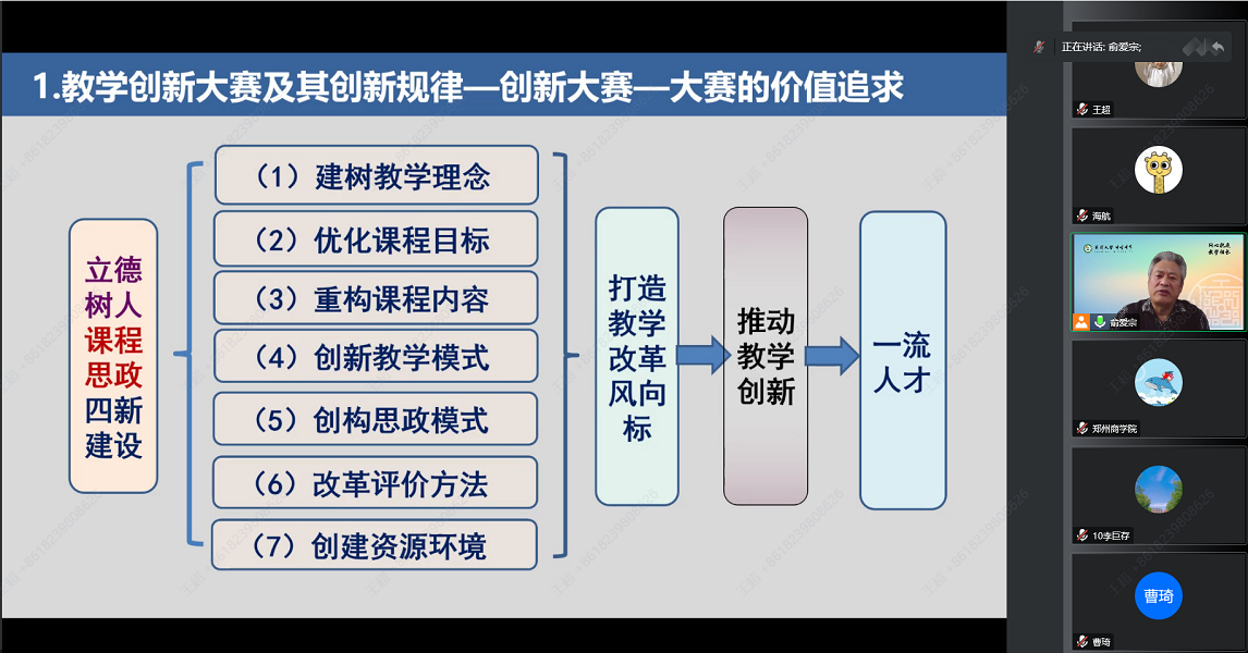 俞爱宗教授对教学创新内涵及其遵循的规律、教学创新逻辑及课堂诊断、教学创新具体设计及实践进行了深入分析;结合具体课程的教学创新实例,全面阐述了教学创新凝练的依据、内容和方法;分享了其在多年教学创新大赛指导中针对教学创新中教学目标优化、教学内容重构、教学模式创新总结出的具体策略;对教学创新设计中课程思政、教学环境、教学评价等要素的理念、问题、诊断、创构进行了论述,重点讲解了教学模式创新、思政创构、环境与资源、教学评价改革、创新效果凝练等具体要素需要考虑的因素、凝练的逻辑与途径。