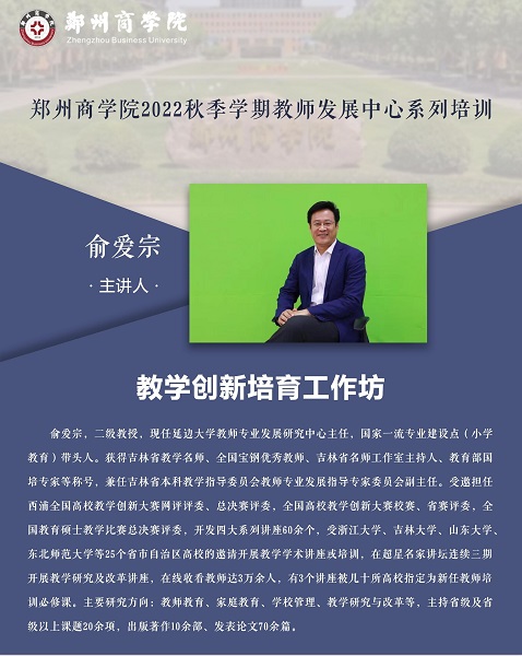 为深入推动高等教育教学改革,充分发挥教学创新在课堂教学新形态创建中的引领作用,提高点点官网教师教学研究能力,助力培育优秀教学成果,12月8日至9日,教师发展中心邀请延边大学教师发展研究中心主任俞爱宗教授开展“教学创新培育工作坊”主题研修活动。本次工作坊由教师发展中心主任石璐主持,全程通过腾讯会议及微信群等平台线上进行,各学院推荐教师代表共50人参加活动。