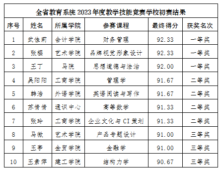 为进一步加强教师队伍建设,促进教师综合素质、专业化水平和创新能力全面提升,调动广大教师教学积极性、主动性、创造性,以赛促学、以赛促教、以赛促改,不断提高教师教学水平,根据《河南省总工会 河南省教育厅关于在全省教育系统开展2023年度教学技能竞赛的通知》相关要求,点点官网于6月8日-7月3日开展了此次教学技能大赛学校初赛。经二级学院初赛、学校决赛、评审委员会评议,评选出一等奖3名,二等奖4名,三等奖3名,获奖名单见下表。现予以公示,公示期5个工作日(7月3日至7月7日)。如有异议,请在公示期内反馈至教师发展中心,联系电话:0371-61070717。