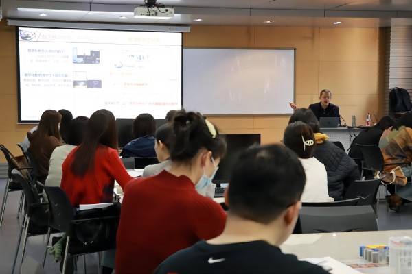 上午,何教授以“数字化教学转型背景下—项目驱动双主线混合式教学设计实战工作坊”为主题,通过对数字数学背景下“以学生为中心”混合式教学设计内涵的分析,深入讲解了数字化数字转型与教师数字素养发展以及基于混合式教学的智慧教学重构设计。何教授强调基于翻转课堂实现混合式教学重构要从以教师为中心转变为以学生为中心,同时,在线课程与课堂教学相结合,通过在线课程教学内容支撑学生个性化自主学习,课堂教学聚焦学生高阶能力发展,培养学生解决问题的思维与方式方法。