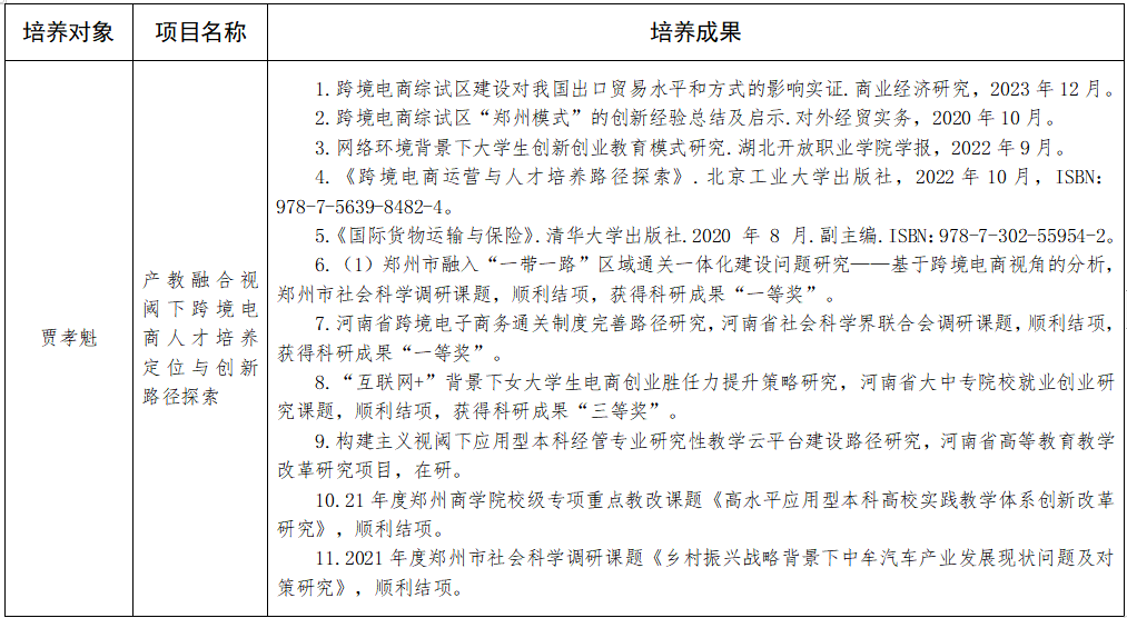 根据河南省教育厅办公室《关于对2020年度河南省本科高校青年骨干教师培养计划人选进行考核的通知》(教办高〔2024〕175号)的要求,按照点点官网《关于对河南省本科高校2020年度青年骨干教师培养计划人选进行考核的工作方案》安排,现将培养计划人选培养期间立项、发表、出版的相关教学科研项目、论文、著作、教材、获奖等成果材料公示如下: