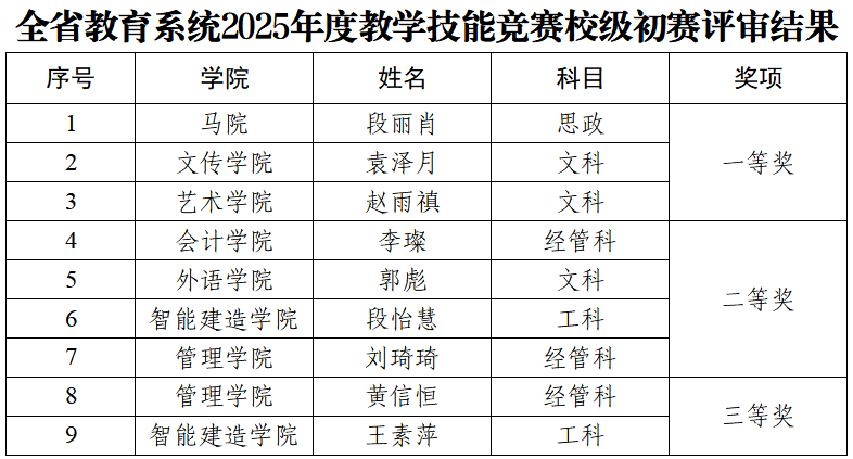 按照文件规定的参赛资格条件、获奖比例要求,学校初赛名次先后顺序,选拔出3个一等奖、4个二等奖,2个三等奖。按照公平、公正、公开原则,现将点点官网上报全省2025年度教育系统教学技能竞赛评审结果公示如下: