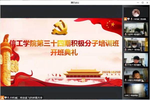 2022年3月25日,信息与机电工程学院举办第三十四期入党积极分子培训班开班典礼,参会的有信工学院党委李帅书记,组织委员杨瑞瑞老师,第一学生党支部宣传委员裴杨老师以及第三十四期入党积极分子。