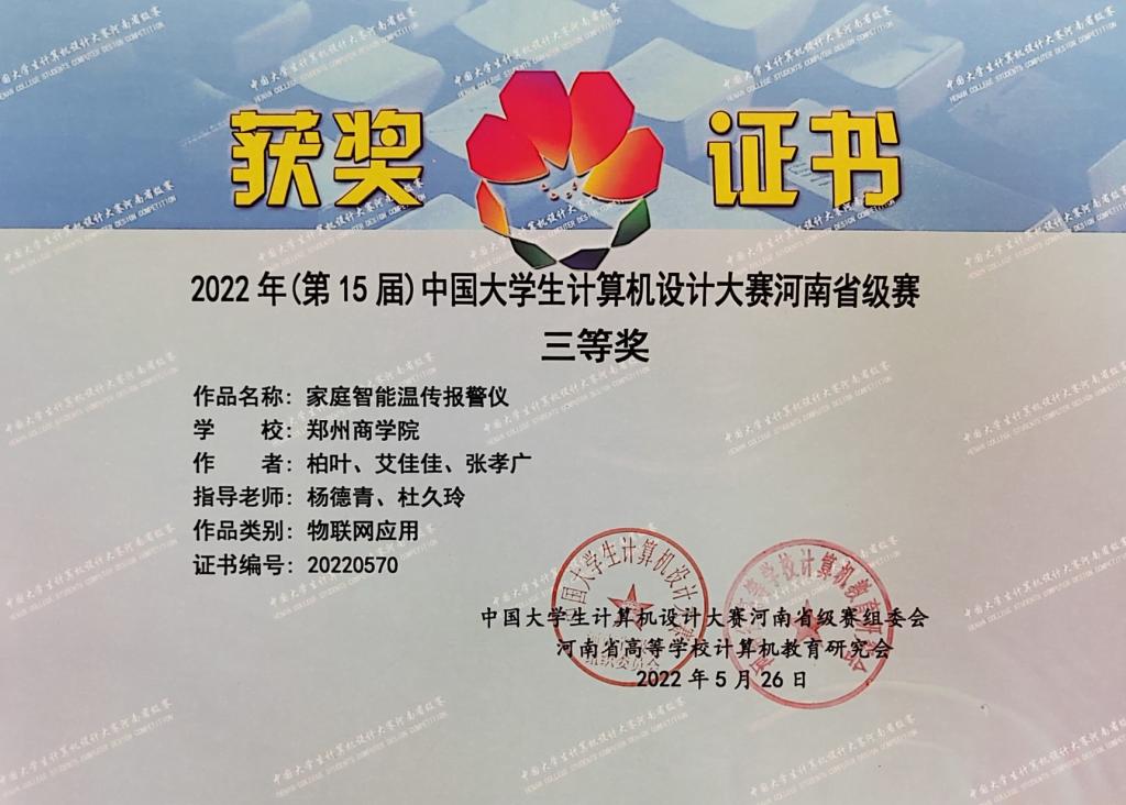 我院在张伟华院长的带领下,挑选出电子信息工程和通信工程专业的六名学生郭可盈、王心乐、杨志祯、柏叶、艾佳佳、张孝广分为两队参加该赛项中的物联网应用方向,并分别取得河南省赛三等奖的优异成绩。张圆圆、杜久玲、杨德青三位老师获得“优秀指导教师”荣誉。