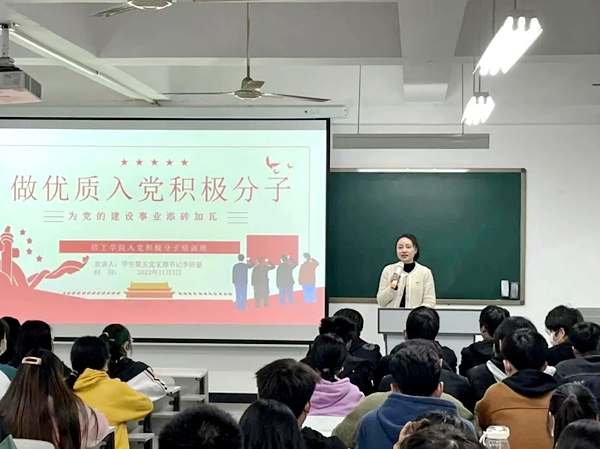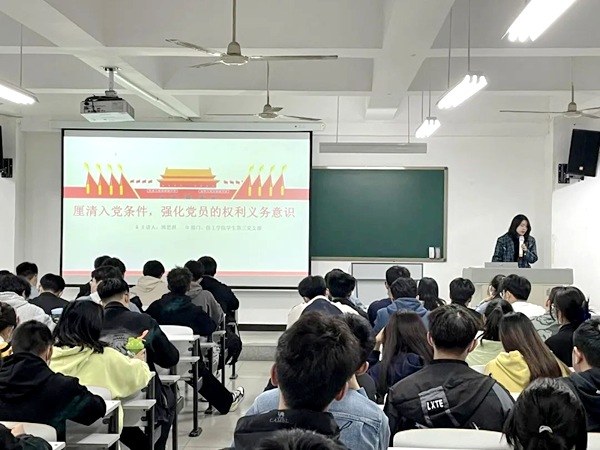2022年11月1日,学院学生第三党支部书记周思淇老师在2号楼301教室开展“厘清入党条件,强化党员的权利义务意识”积极分子专题党课培训。通过本次党课培训学习,入党积极分子定会受益匪浅。作为新时代的先进青年,我们要对照党员标准,严格自律,认真履行党员义务、正确行使党员权利,领悟党全心全意为人民服务的宗旨。对后续深入的学习与实践,更加积极的向党组织靠拢,成为一名合格的共产党员奠定了夯实的基础。