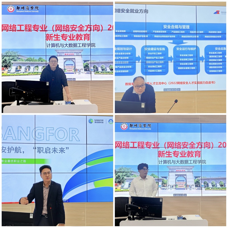 网络工程教研室主任高昂详细解读专业培养目标与课程体系,指出网络安全是国家战略需求,专业建设紧扣时代发展,鼓励新生夯实基础、树立远大志向。网络安全社团指导老师任俊军副教授结合带队参赛获奖经历,分享社团活动与学科竞赛价值,倡导“以赛促学”提升综合能力。河南网训科技有限公司史彦斌工程师从行业视角切入,通过真实案例分析网络安全技术前沿与人才需求,明确实战型人才的稀缺性。优秀学生代表杨长远结合自身经历,从课程学习、资源利用、方向规划三方面给出实用建议。
