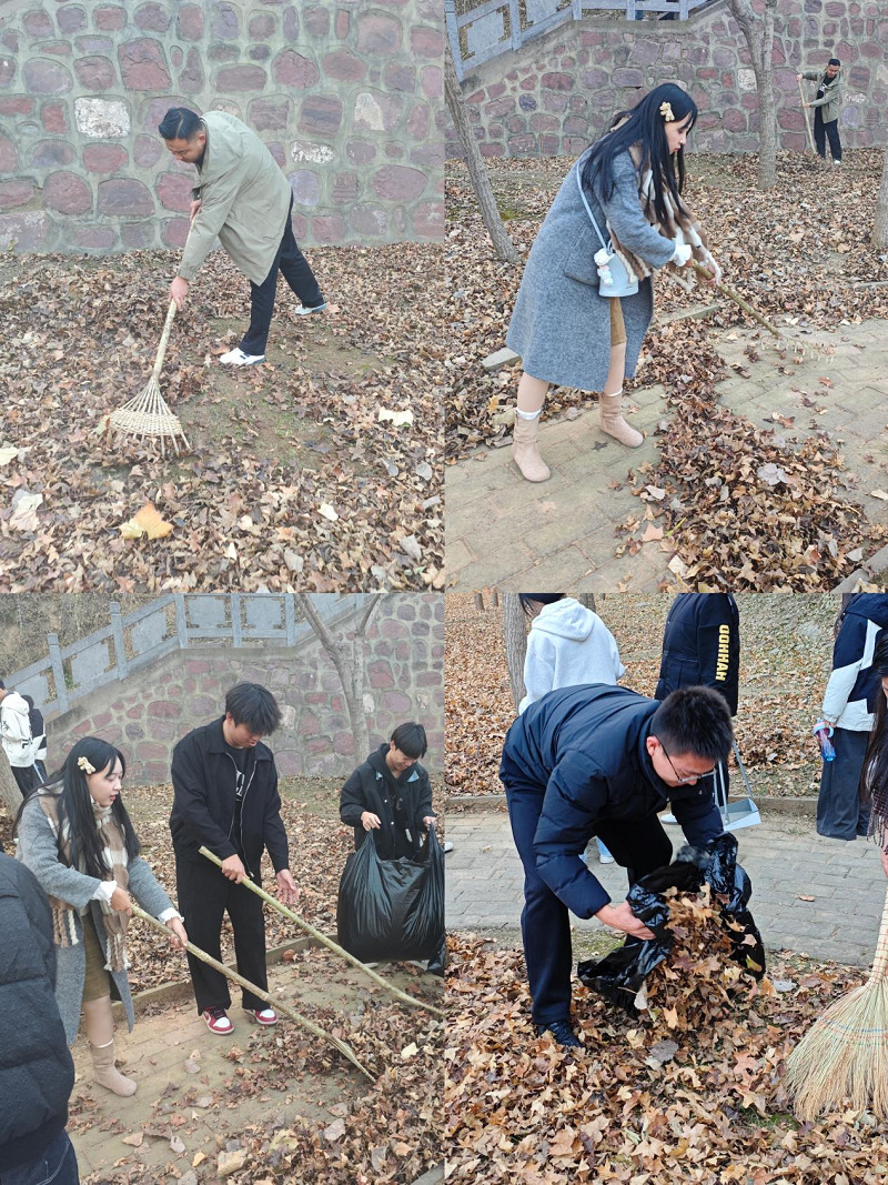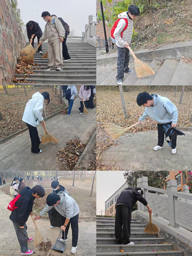 劳动开始前,姜老师明确分工,划定清扫区域,为其准备好扫帚、簸箕、垃圾袋等工具。劳动过程中,同学们热情高涨、分工协作,有的仔细清扫地面落叶与碎石,有的认真清理林间的纸屑、塑料瓶等杂物。大家不怕脏、不怕累,以饱满的热情投入劳动,用实际行动诠释责任与担当。经过近两小时的辛勤付出,外语楼北侧区域干净整洁、焕然一新,为师生出行创造了舒适的环境。