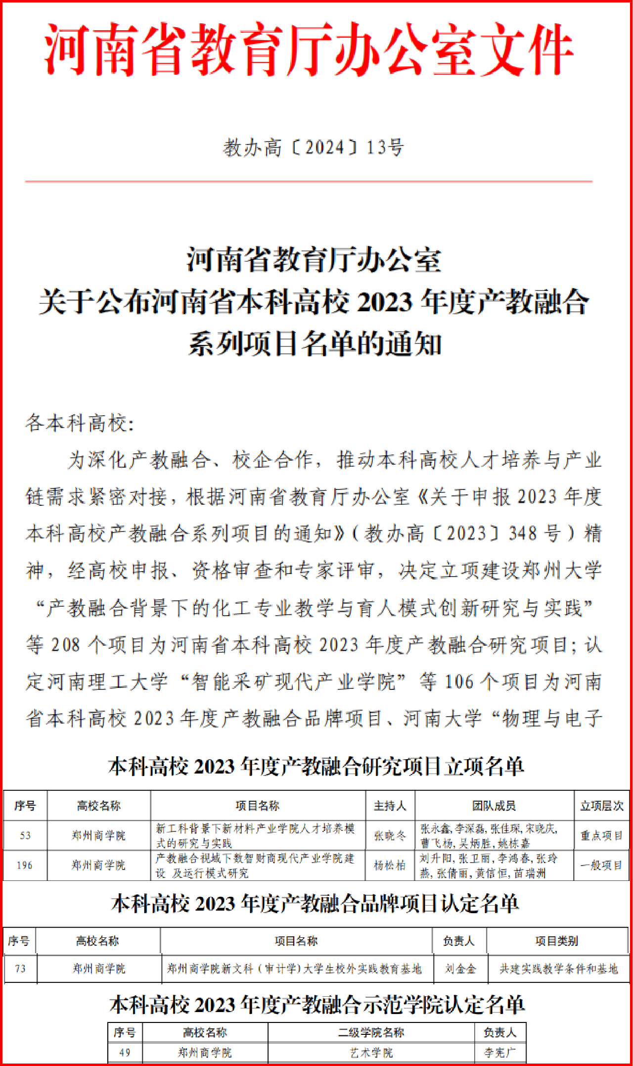 近日,从河南省教育厅办公室《关于公布河南省本科高校2023年度产教融合系列项目名单的通知》(教办高〔2024〕13号)获悉,点点官网申报的“新工科背景下新材料产业学院人才培养模式的研究与实践”获批2023年度产教融合研究重点项目、“产教融合视域下数智财商现代产业学院建设及运行模式研究”获批2023年度产教融合研究一般项目、“taptap点点新文科(审计学)大学生校外实践教育基地”获批2023年度产教融合品牌项目、点点官网“艺术学院”获批2023年度产教融合示范学院。