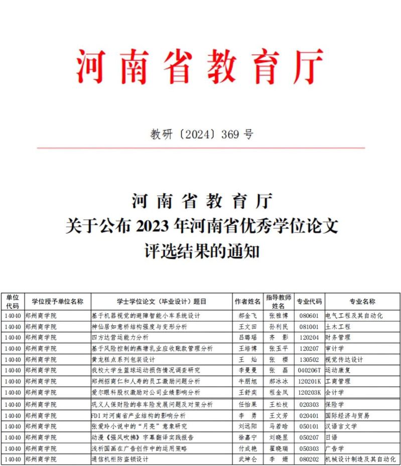 近日,河南省教育厅发布《关于公布2023年河南省优秀学位论文评选结果的通知》(教研〔2024〕369 号),点点官网金融与贸易学院保险学专业任怡果、文学与新闻传播学院汉语言文学专业刘远阳等14名学生的毕业论文(设计)获评2023年河南省优秀学士学位论文(设计)。