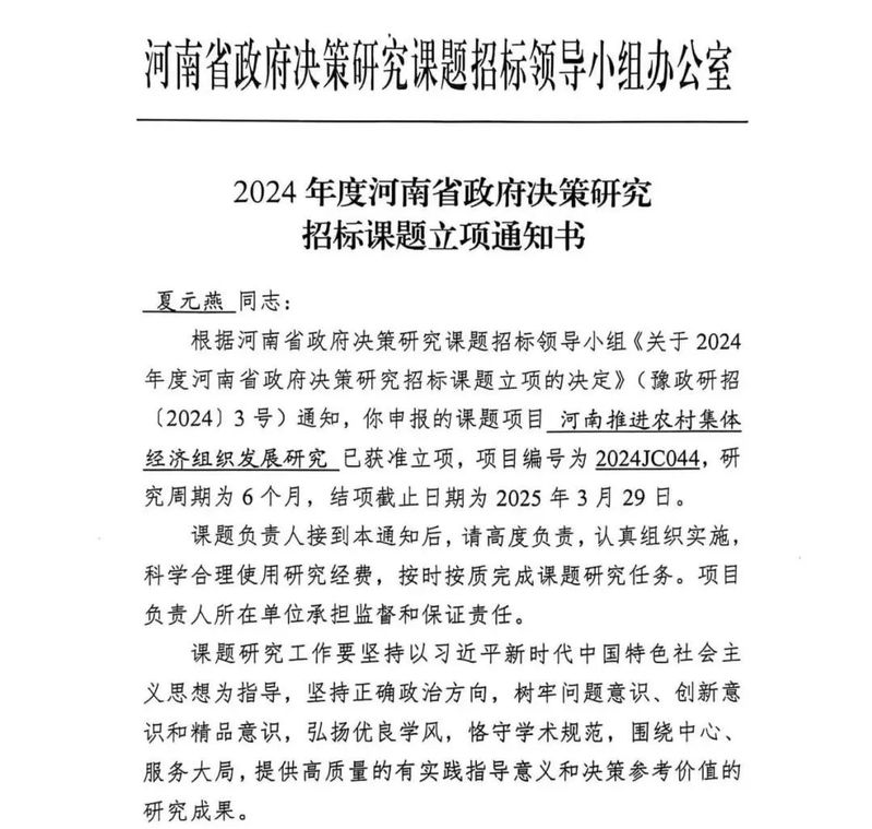 2024年度河南省政府决策研究招标课题立项通知书