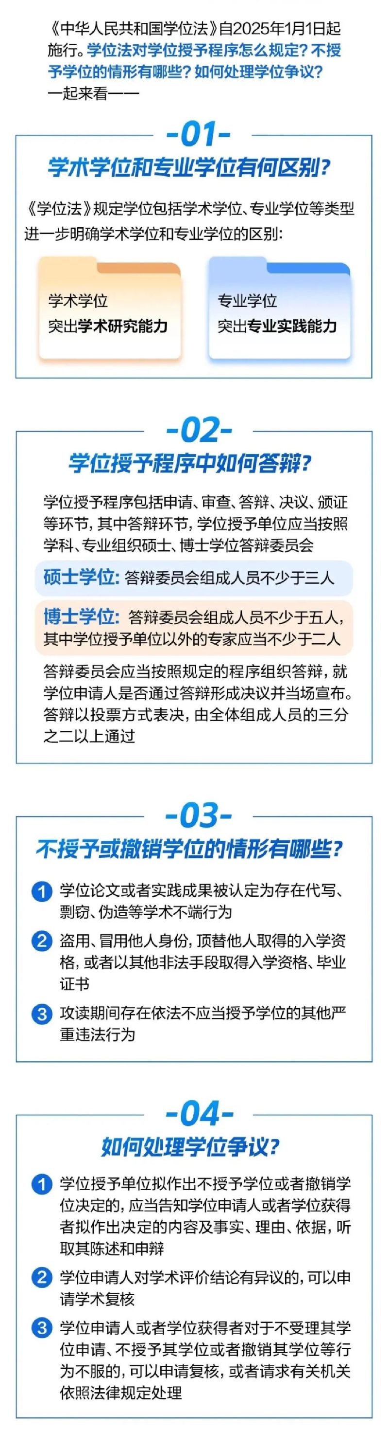 2024年4月26日,第十四届全国人民代表大会常务委员会第九次会议表决通过《中华人民共和国学位法》,自2025年1月1日起施行。这是自1981年1月1日起《中华人民共和国学位条例》实施以来,我国学位法律制度的首次全面修订,是新时代学位工作和教育法治建设的一项重大成果,对规范学位授予工作,保护学位申请人的合法权益,保障学位质量,培养担当民族复兴大任的时代新人,建设教育强国、科技强国、人才强国,服务全面建设社会主义现代化国家具有重要意义。