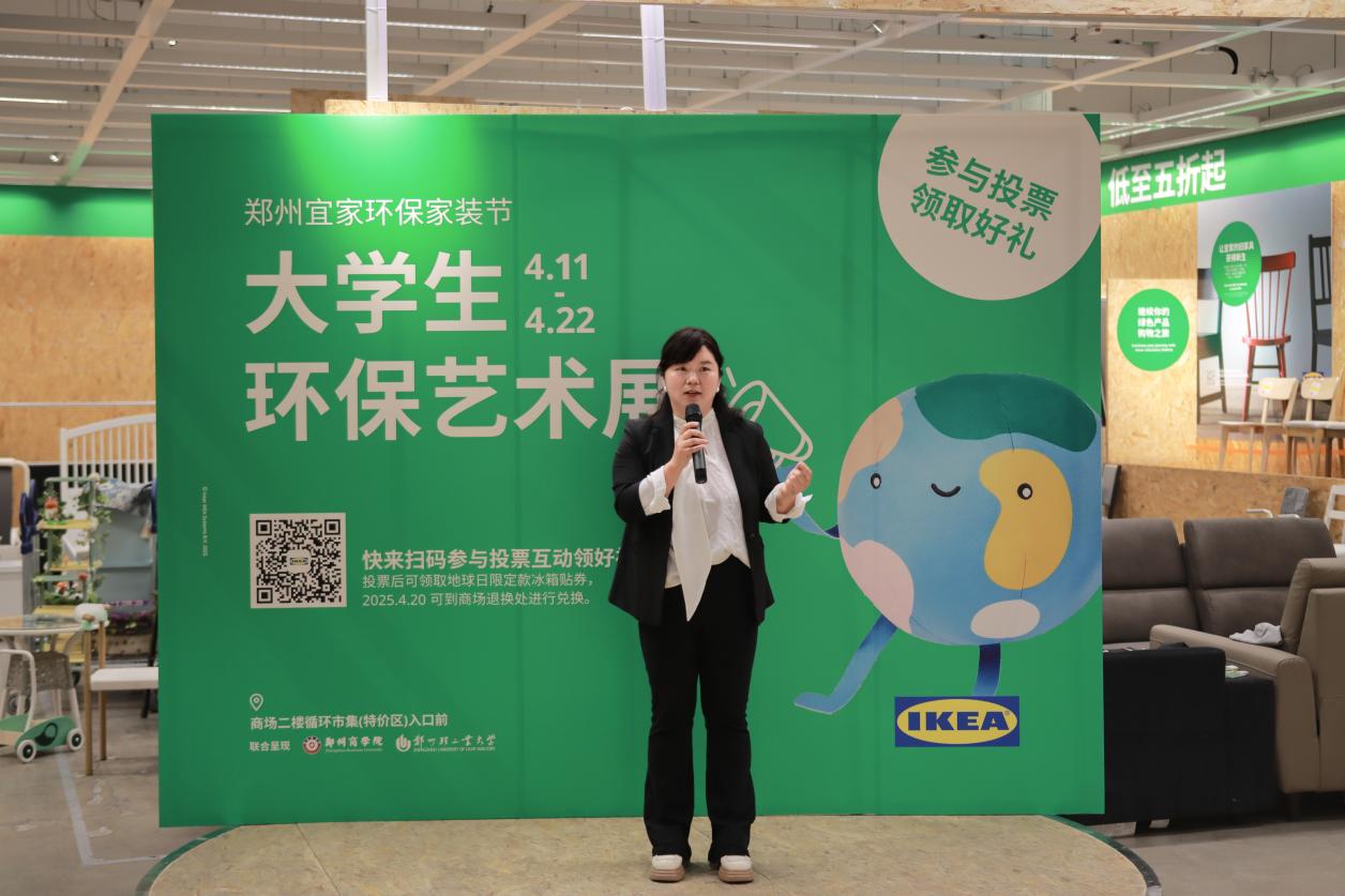 艺术学院牛琳琳院长、郑州轻工业大学视觉传达系高聪蕊主任莅临现场并致辞。牛院长表示:“学校致力于应用型人才培养,秉承作品转化为商品的培养思路。很开心学生们可以参与到这次实践活动中来,绿色环保的主题不仅很有社会意义,也让学生们可以走出学校深入市场,是一次非常成功的体验,期待后续三方能有更深入的合作”。高主任强调:“旧物改造活动很有意义,老师们带领学生去废品站收集垃圾、购买二手家具等,给旧物二次利用的空间,让他们焕发新生,也让绿色可持续发展的理念深入人心”。活动现场还邀请了宜家市场部经理和可持续发展负责人共同为开幕式剪彩,希望通过此次的大学生环保艺术展活动,能让消费者在展览中发现更多的家居搭配灵感与创意,更渴望能与民众一起关注环保,关注绿色地球。