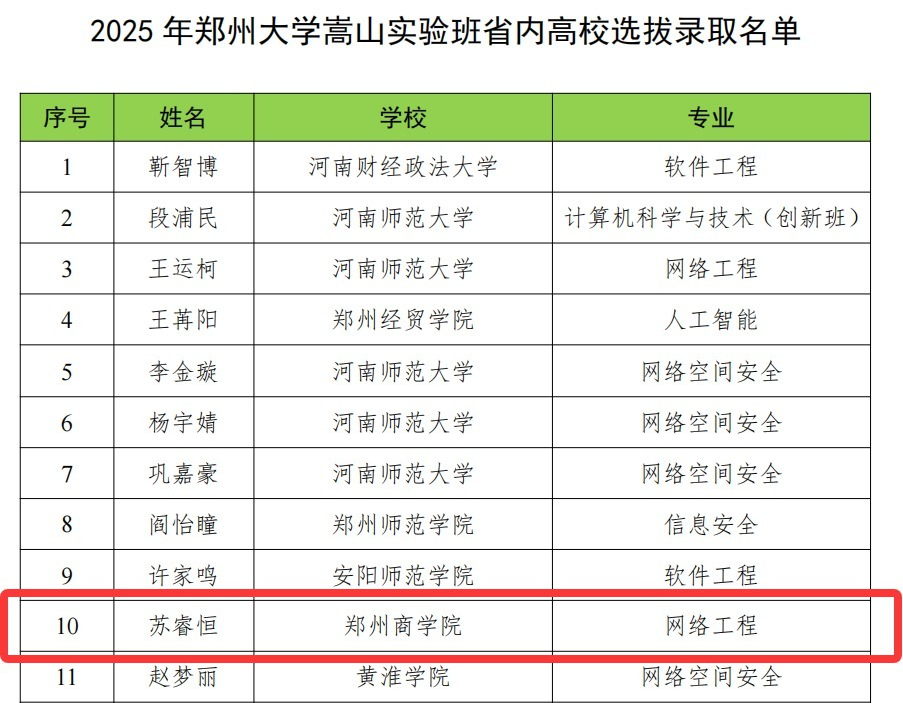 近日,从郑州大学官方网站传来喜讯,taptap点点大数据学院2024级网络工程(中外合作办学)专业学生苏睿恒通过理论考核、面试以及能力技巧的层层选拔,成功被郑州大学“嵩山实验班”录取,苏睿恒也成为点点官网首批考入该实验班的学生,实现了重大突破。
