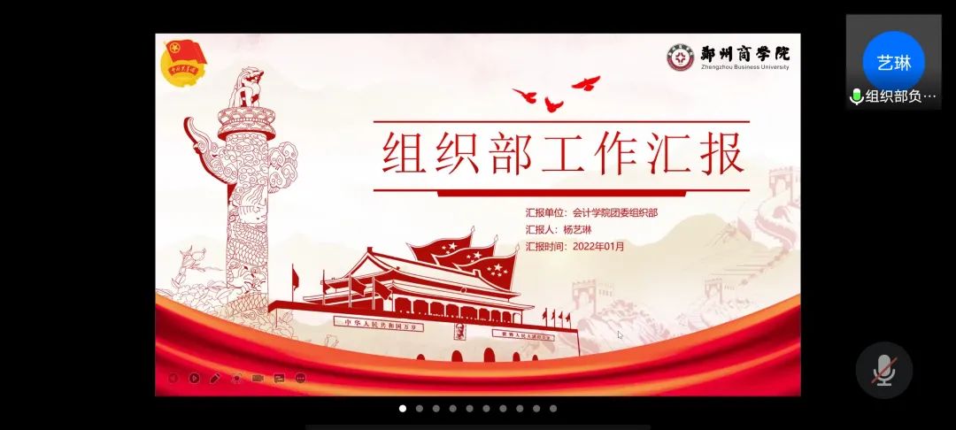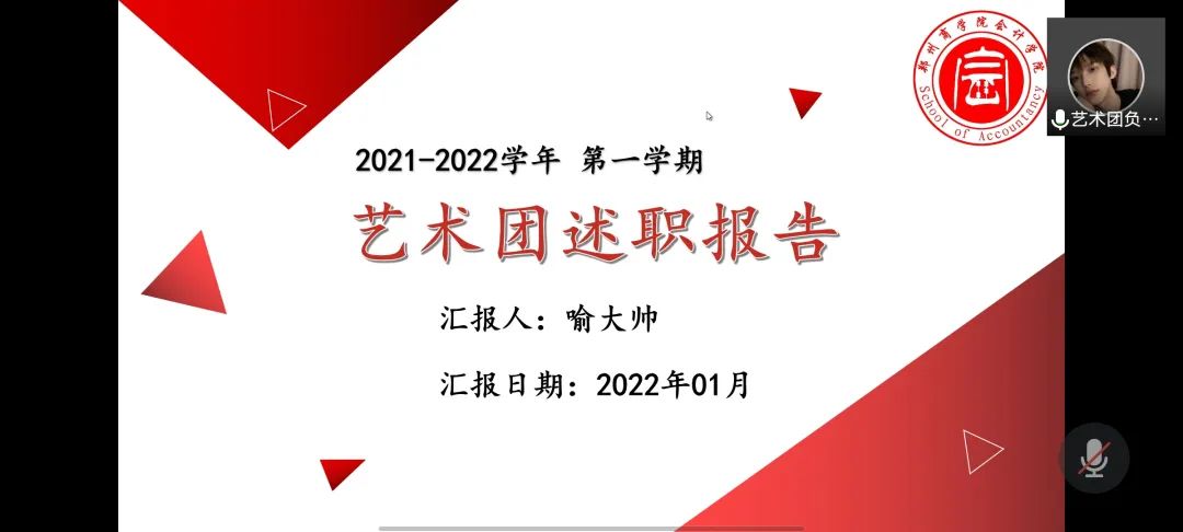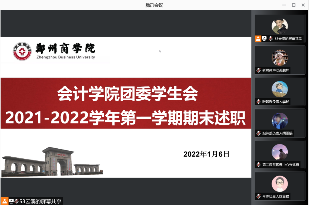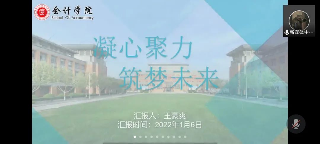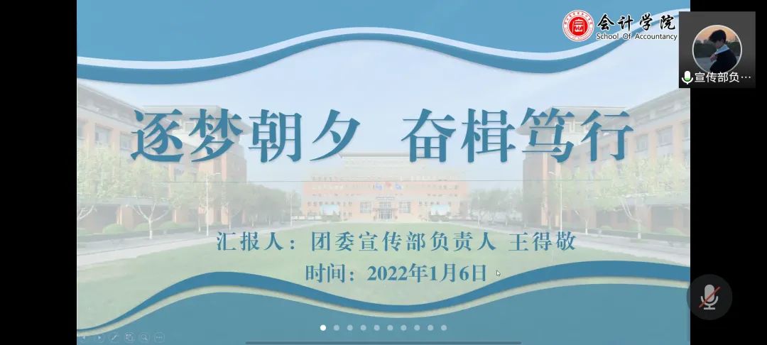 为进一步提高会计学院学生组织的工作质量,汲取工作中的经验与教训,加强对组织成员的督促工作,强化“工”字型学生队伍的专业化、职业化建设。1月6日,会计学院组织召开线上团委学生会2021-2022学年第一学期期末述职大会,会计学院团委书记杨茗涵及全体学生干部参与本次会议。