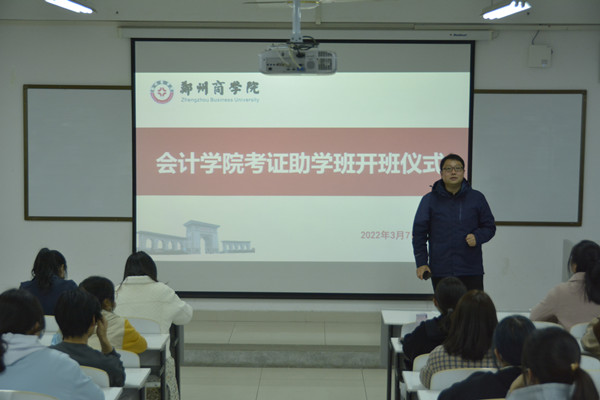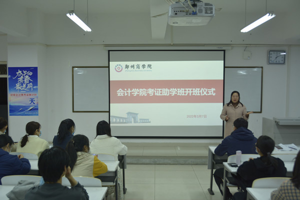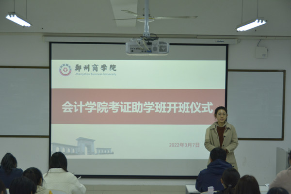 为更好落实分层分类的教学指导思想,实现高素质应用型人才培养目标,提升学生专业学习能力,我院特为学生开设考证助学班。3月7日晚7点,我院在广恩楼104教室隆重召开了考证助学班开班仪式,会计学院院长祝利芳、党委书记梁鹏、副院长刘金金、教师代表及助学班学生参加此次开班仪式。仪式由刘金金副院长主持。
