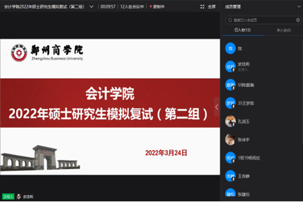 为使学生提前了解研究生模拟复试流程,提高考试应变能力,增强学生考研信心,助力学生成功上岸,3月24日下午,我院借助钉钉会议举行研究生模拟复试工作。此次模拟复试分为两组,由会计学院院长祝利芳教授、会计教研室张建松教授担任主考官,刘金金副院长、白静副教授、武佳莉老师、宋若男老师分别担任主持人和工作组组长。