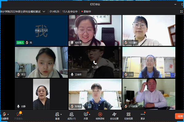 会计学院高度重视学生考研工作,在前期统计学生考研成绩后,积极为学生进行线上线下辅导答疑,制定考研模拟复试方案。通过线上模拟复试,及时发现学生存在的问题,有针对性地给予学生指导,有助于学生掌握复试技巧,从容应对复试,助力学生考研成功。