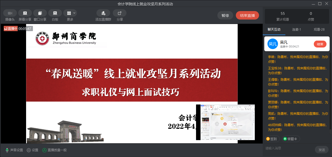 为进一步提高学生的求职面试技巧,深入推进我院毕业生就业工作,全力促进未就业毕业生顺利就业,及早谋划2023届毕业生就业工作,努力实现高质量和更充分就业,4月19日晚,会计学院组织开展“春风送暖”线上就业攻坚月系列活动——求职礼仪与网上面试技巧。本次讲座由上海师范大学经济学硕士吴凡主讲,采用线上的教授方式,2023届毕业生参与此次活动。