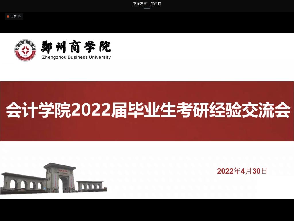 2022考研落下帷幕,为帮助2023届考研学生进行复习规划,高效备考,4月30日晚,会计学院举行2022届毕业生考研经验交流会,我院院长祝利芳、副院长刘金金、考研小组的各位教师以及2019级考研班学生参加了此次会议,会议由管理会计教研室主任武佳莉老师主持。